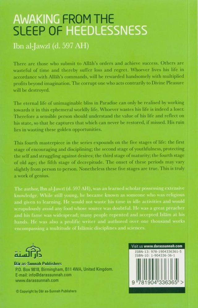 Awaking From the Sleep of the Heedlessness BY Ibn al-Jawzi There are those who submit to Allah,s order and achieve success. Others are wasteful of time and thereby loss and regret. Whoever lives his life in accordance with Allah,s commands, will be rewarded handsomely with multiplied profits beyond imagination. The corrupt one who acts contrarily to Divine Pleasure will be destroyed. This fourth masterpiece in the series expounds on the five stages of life: the first stage of encouraging and disciplining; the second stage of youthfulness, protecting the self and struggling against desires; the third of maturity; the fourth stage of old age; the fifth stage of decrepitude. The onset of these periods may vary slightly from person to person. Nonetheless these five stages are true. This is truly a work of genius.