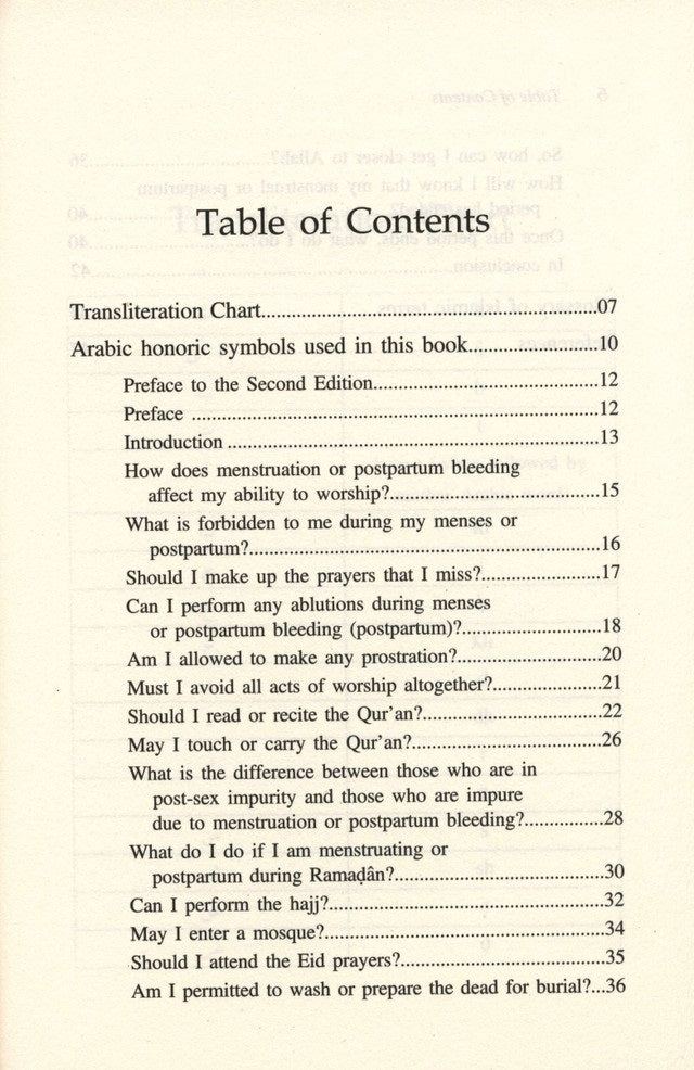 What every Muslim woman needs to know about her menses and after giving birth Whenever a Muslim woman has a question about her religion, she should seek the answer in the Qur’an (ALLAH's revealed Word) and the Sunnah (the example in word and deed) of His Prophet Muhammad (blessings and peace of ALLAH be upon him). If the answer is not found in these two sources, she should look to trustworthy Muslim scholars for help. She is encouraged to read, study, and learn as much as she can about her religion, for the search for religious knowledge is an obligation upon every Muslim individual. A Muslim woman who is learning about her religion finds out quickly that the menstrual period and the period of bleeding after childbirth (postpartum bleeding) are times for her to leave off certain acts of worship such as formal prayer and fasting. It is important for believing women to be aware of exactly which acts are forbidden and which ones are permitted to them in these situations. This book is intended to clear up the issue as much as possible, with ALLAH’s permission.