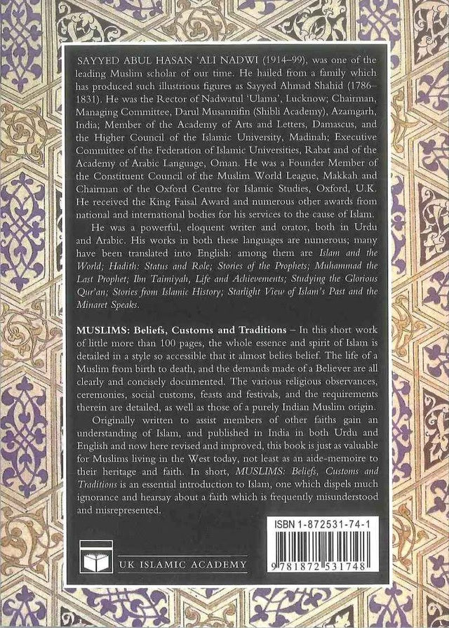 Muslims Beliefs, Customs & Traditions Author:Syed Abul Hassan Ali AL NadwiBinding:Soft CoverPages:136Size cm:15x21 CmPublisher:UK Islamic AcademyShelf Location 2:09B Muslims Beliefs, Customs & Traditions Description from the publisher: In this short work of little more than 100 pages, the whole essence and spirit of Islam is detailed in a style...