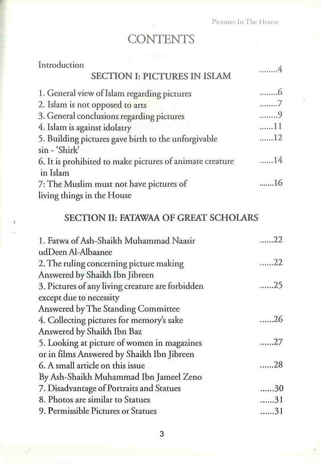 This booklet comes as a piece of advise and as a warning - it is a collection of ahadeeth and fatawa from different scholars on the issue of pictures. Every Muslim should know that it is dangerous to have pictures in the house and in the office and or any place of gathering. The angels of mercy will not visit such places where pictures are hung or decorated. Gradually these pictures lead to idolatry. It also disturbs the concentration in prayer. The picture maker is cursed and he will be punished on the day of resurrection for not giving life to those pictures of living creatures. Making a living from this kind of work is prohibited in Islam