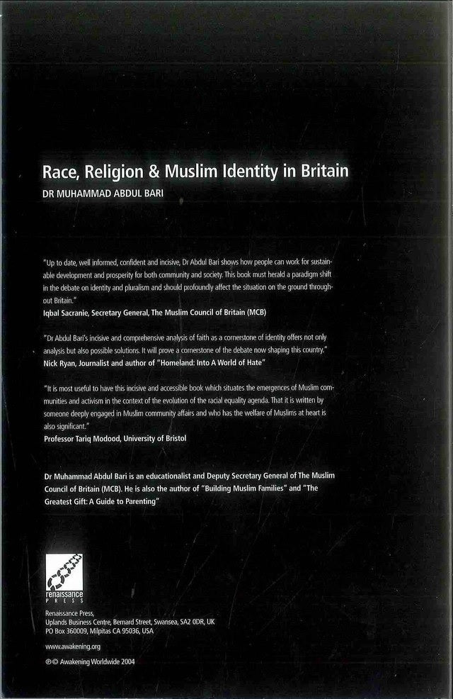 Race, Religion & Muslim Identity in Britain Author:Muhammad Abdul BariBook By Language:EnglishBinding:Soft CoverPages:163Size cm:14x22Publisher:Renaissance PressShelf Location 2:06B This book offers incisive and comprehensive analysis of faith as a cornerstone of identity and possible solutions. A timely book after the recent tragedies in London which took place during July 2005. With...