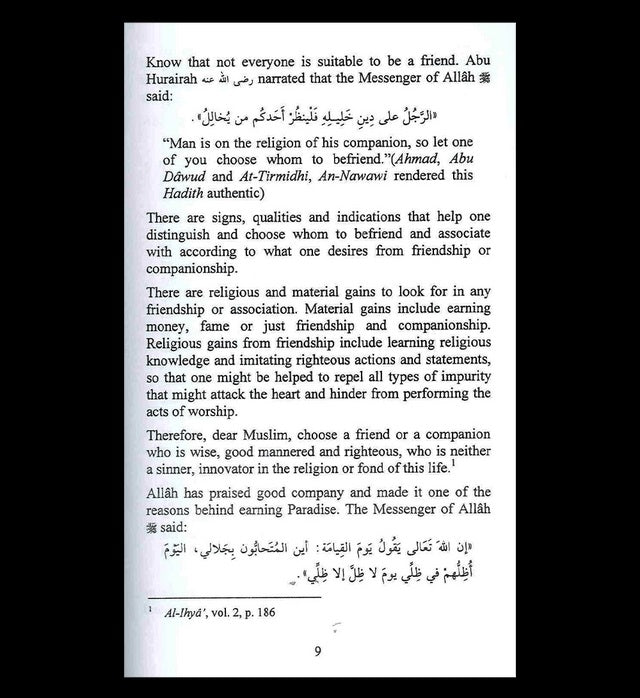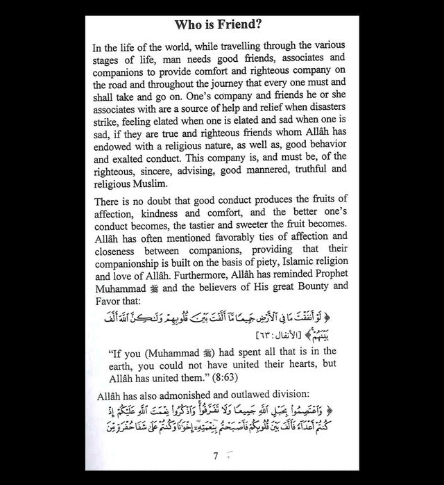 The Road to Good Friendship by Abdul Malik Al-Qasim The distinguished feature of this booklet is to enhance good friendship in society. The author has selected the illuminating sayings of the Prophet(pbhu) and those of his Companions and the Salaf. These advices will encourage good friendship in the Muslim society and will open the door wide to establish a civilized Islamic culture. This society based on true friendship will breed justice, equality and love for humanity.