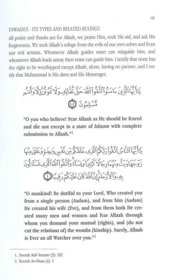 Seeking a means of nearness to Allaah - Its types and its rulings. 'The people are in great confusion about the matter of Tawassul and its rulings in the religion, and they greatly differ concerning it, some declaring it lawful and other prohibiting it, some going to extremes and others being over-lenient. Also, a large number of the Muslims have been used to saying in their supplications for centuries such things as: 'O Allaah by the right of your Prophet...,' or 'by the right of the Sacred House...forgive me.; 'O Allaah by the right of the Awliyaa and the pious, and so and so etc.' Or 'O Allaah by the honour of the men of Allaah to You, and by the honor of those in whose presence we are, and under whose assistance we exist, relieve us and the distressed from all distress'... '...Some people even go so far beyond bounds that they even allow tawassul to Allaah, the Most High, through some inanimate objects from the creation that do not even reach the level of the aforementioned, such as graves of the Awliyaa, metal structures built upon their tombs, and earth, stones and tress found nearby. They claim that whatever is near to those who are honoured itself becomes honoured, and that the honour which Allaah bestows upon the occupant of a grave passes on to the grave itself, so that it becomes a means of Waseelah to draw nearer to Allaah thereby. Indeed some of the later people allow directly seeking aid from others besides Allaah!' 'So what is Tawassul? What are its types? What is the meaning of the Aayaat and the ahaadeeth which mention it? And what is the correct ruling for it in Islaam?'