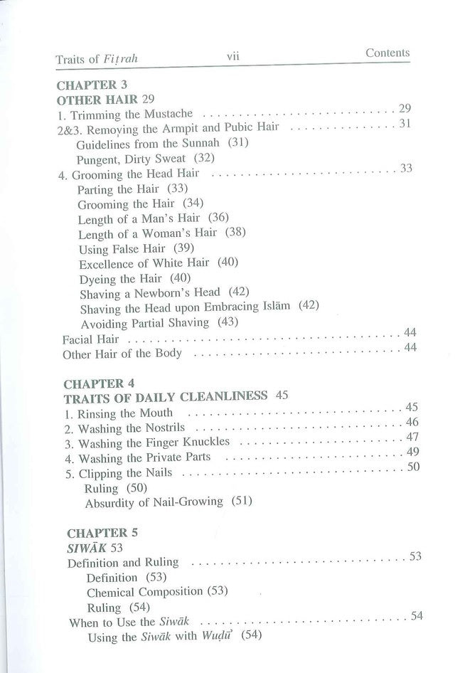 About the Book: Allaah commands the believers to adhere to lslaam in its totality: "0 you who believe! Enter into Islaam completely, and do not follow the footsteps of Satan. 'verily, he is to you a clear enemy" [Al-Baqarah 2:208] The true way to guidance and prosperity is through correcting our apparent deeds by complete adherence to the Sunnah, and our hearts by sincerity and continued awareness of Allaah . May He grant us guidance and facilitation. This Book Deals with the traits of fitrah which are among the issues that some people consider "small" or "minor". However, they are all very important for a Muslim who wishes to maintain healthy hygiene and a dignified appearance, guided in that by Allah's revelation, In addition to the beard, we deal in detail with the issues of grooming the hair, siwak, circumcision, and so on.