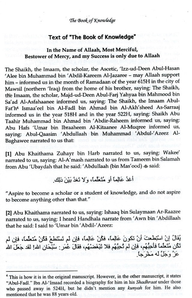 This is the first book in the "Classical Knowledge Series" - a collection of selected scholarly works from the past that deal with the subject of religious knowledge. This particular book is a translation of the famous classical work "Kitaab-ul-'Ilm", a collection of narrations about the virtues, merits, manners, and etiquettes of knowledge, written by Imam Abu Khaithama An-Nasaa'ee (Died 234H). In this initial installment, the reader will have a glimpse into the statements and actions of our pious predecessors with regard to seeking, spreading and implementing knowledge. - -- There are over 160 narrations in total, including statements of the Prophet, his Companions, the Taabi'een and the succeeding early generations. In addition to this, the great scholar of Hadeeth of recent times, Imam Muhammad Naasir-ud-Deen Al-Albaanee, has reviewed the treatise and verified the narrations contained within it, distinguishing the authentic from the weak. So this treatise is of great benefit and deserving of being read and studied by every Muslim, whether in gatherings or individually. Lastly, due to the nature of verifying narrations, many terms related to the Science of Hadeeth were employed by Imam Al-Albaanee throughout the footnotes in the treatise. Explanations of these terms and concepts can be found in the Glossary section at the back of the book. We ask Allah to make this publication a guiding light to those who read it and an invaluable resource of reference for those who study it and use it for research. Important Note: This book contains the Arabic text for all of its narrations including the vowelization of all letters so as to make it an easy to study reference-guide. It is the perfect book for people to study in gatherings and circles or for one to just read on his own and encourage himself to seek and spread knowledge. May Allah accept this effort? About the Author: He was a great Haafidh (i.e. scholar of Hadeeth), reliable in narration and firm in memory. He narrated hadeeth from many scholars, the likes of Sufyaan bin ‘Uyainah, Hushaym bin Basheer, Yahyaa bin Sa’eed Al-Qattaan, ‘Abdur-Rahmaan bin Mahdee and Wakee’. Similarly, many scholars narrated from him, such as Al-Bukhaaree and Muslim, the latter of who reported so many hadeeth on his authority that they number past a thousand. The scholars agree unanimously upon his reliability and trustworthiness. Ibn Hibbaan (rahimahullaah) said of him: “He was precise and accurate in narration. And he was one of the close companions of Ahmad and Yahyaa bin Ma’een.” Al-Khateeb Al-Baghdaadee (rahimahullaah) said: “He was reliable, trustworthy, a Haafidh (scholar of Hadeeth) and precise (in narration).” He was born in the year 160H and died in the year 234H, may Allah have mercy on him.