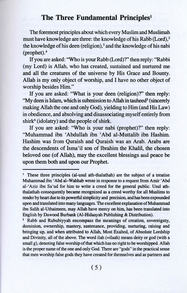 One of the most influential Islamic scholars of the modern era, Muhammad Ibn Abdul Wahhab At-Tamimi is credited with revitalizing the beliefs and practices of the Prophet Muhammad (pbuh ) and the way of as-Salaf as-Salih. This book introduces to the English language a highly popular distillation of his teachings on the fundamental duties of Muslims with respect to their faith. A short and direct guide, it identifies the meanings and categories of Tawheed (Islaamic monotheism), shirk (idolatry) and taghut (false objects of worship). It also elaborates on the meaning of the shahadah (testimony of faith), its conditions and implementation, and the causes of its nullification. An indispensable resource for Muslims and students of knowledge.