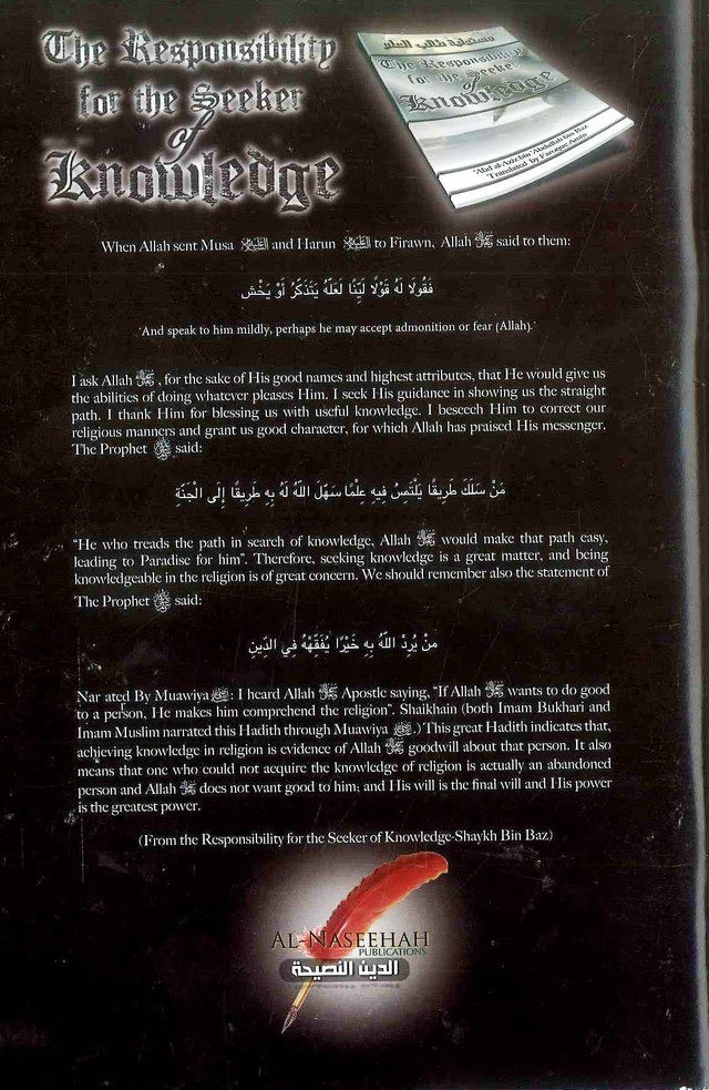 The Responsibility For The Seeker of Knowledge Author:Abd al-Aziz bin Abdullah bin BaazBinding:Soft CoverPages:48Size cm:15x21 CmPublisher:Al-Naseehah Publication The Responsibility For The Seeker of Knowledge The Responsibility of the seeker of Knowledge towards himself Sincerity and Royalty for the sake of Allah Preaching and Teaching Calling and Inviting people towards Allah...