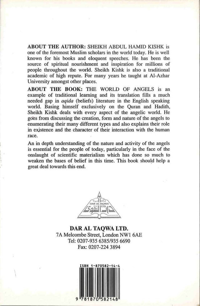 The World of the Angels Author:Sheikh Abdul Hamid Kishk.Book By Language:EnglishBinding:Soft CoverPages:94Size cm:14x22Publisher:Dar Al Taqaweight:185g The world of Angels is an example of traditional learning and its translation fills a much needed gap in aqida (beliefs) literature in English speaking world. Basing himself exclusively on the Quran and Hadith, Sheikh...