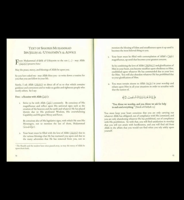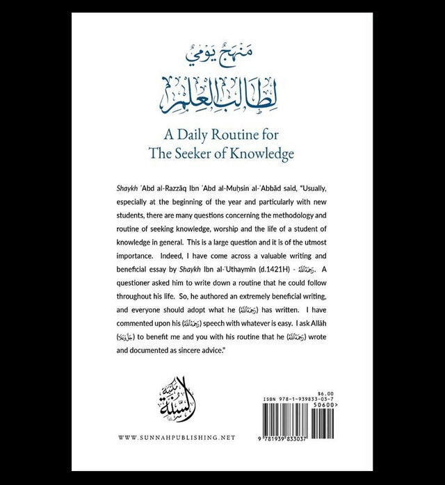 A Daily Routine for The Seeker of Knowledge Author:Muhammad Bin Salih Al UthayminBinding:soft coverPages:64Size cm:14x21Publisher:Sunnah Publishing A Daily Routine for The Seeker of Knowledge by The Noble Shaykh, al-ʿAllāmah, Muḥammad Ibn Ṣāliḥ al-ʿUthaymīn (d.1421H) with commentary by Shaykh ʿAbd al-Razzāq Ibn ʿAbd al-Muḥsin al-ʿAbbād Shaykh ʿAbd al-Razzāq Ibn ʿAbd al-Muḥsin...