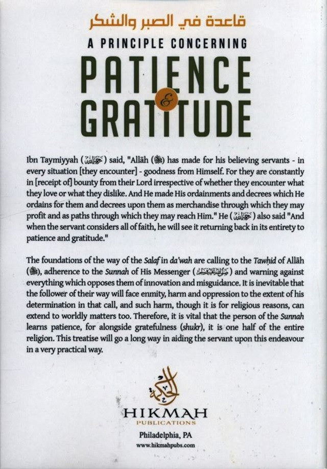 A Principle Concerning Patience & Gratitude Author:Shaykh al -Islam Ibn TaymiyyahBinding:soft coverPages:77Size cm:14x21Publisher:Hikmah PublicationShelf Location 2:11A Ibn Taymiyyah said, "Allah has made for his believing servants - in every situation [they encounter] - goodness from Himself. For they are constantly in [receipt of] bounty from their Lord irrespective of whether...