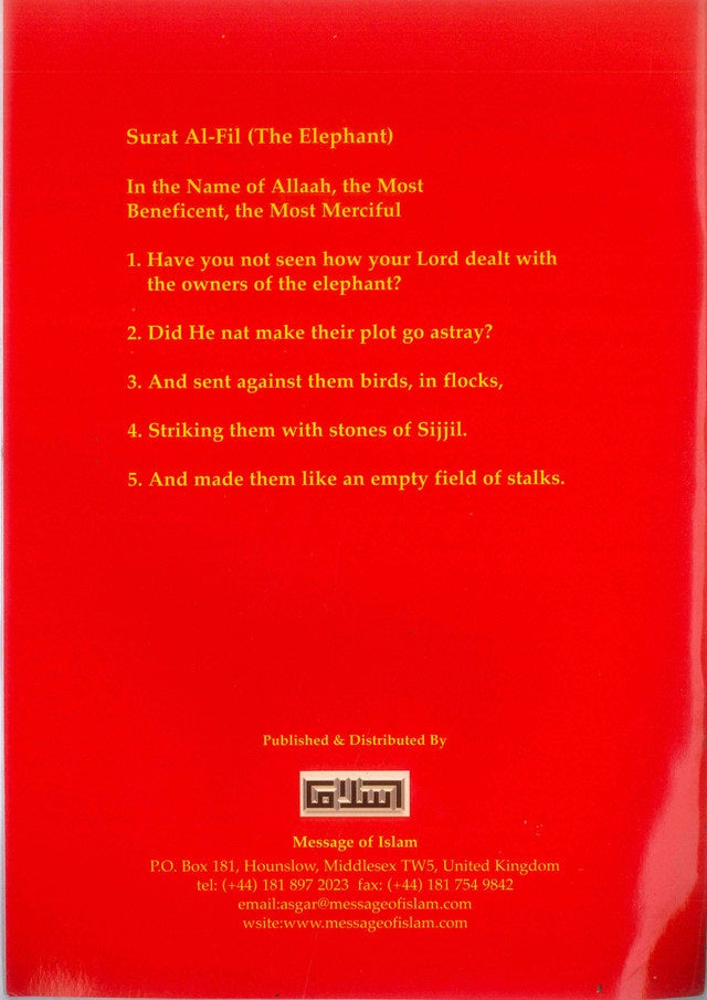 Abraha and His Army of Elephants Author:Shazia NazleeBook By Language:EnglishBinding:Soft CoverPages:12Size cm:17X22Publisher:Message Of Islam Abraha and His Army of Elephants Surat Al-Feel (The Elephant) In the Name of ALLAH, the Most Beneficient, the Most Merciful 1-Have you not seen how your Lord dealt with the owners of the elephant?...