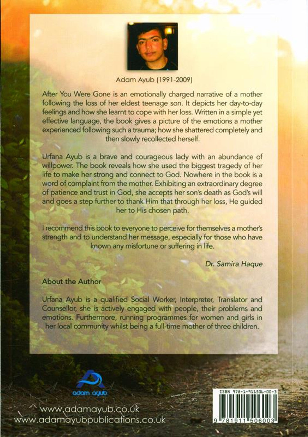 After You Were Gone Author:Urfana Ayub.Binding:soft coverPages:206Size cm:15x21weight:334g After You Were Gone Next This book is a heartfelt account written by his mother it explores her journey of bereavement in the first year of his death she talks through her religious path and also the different emotional challenges she...