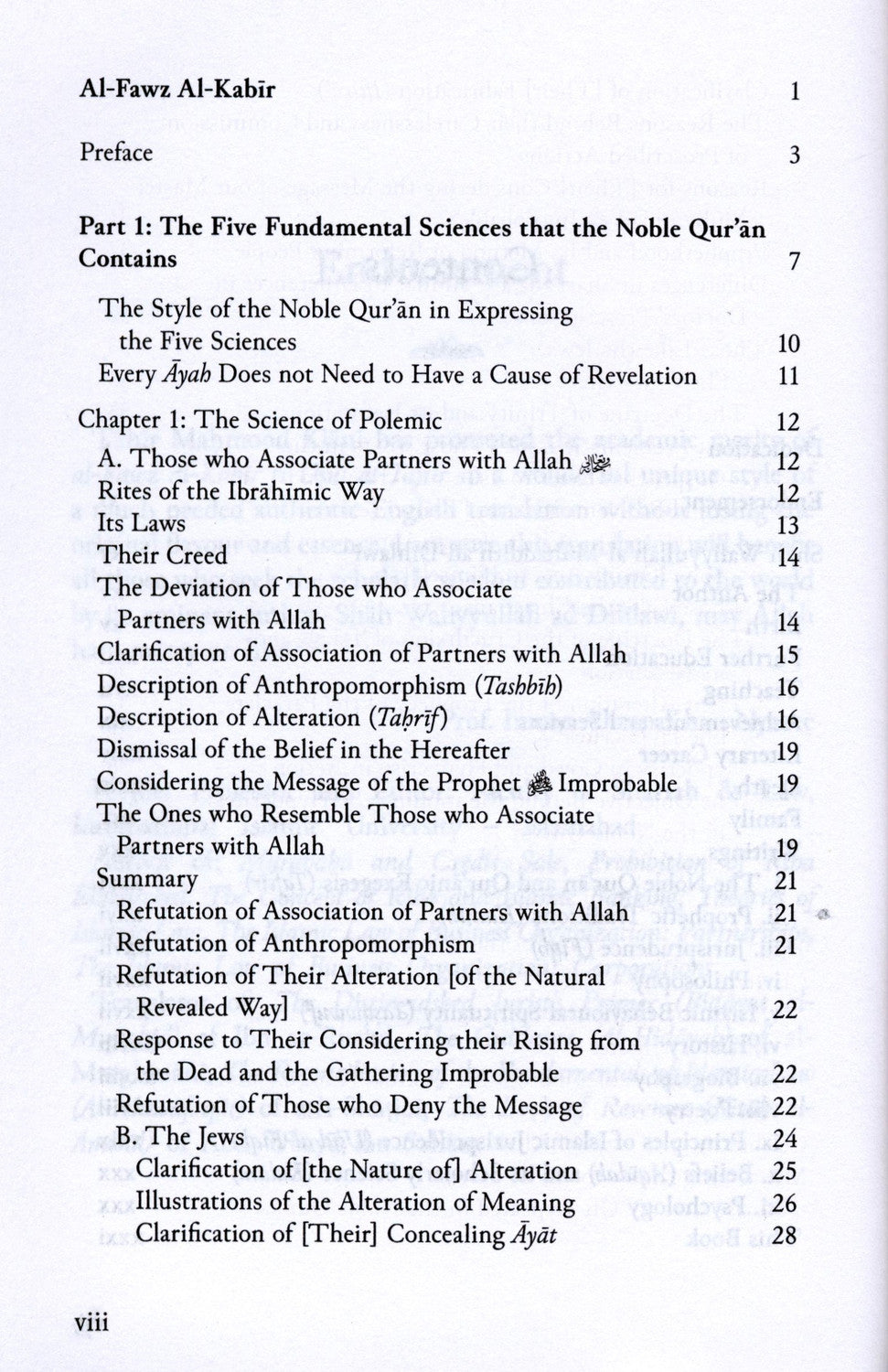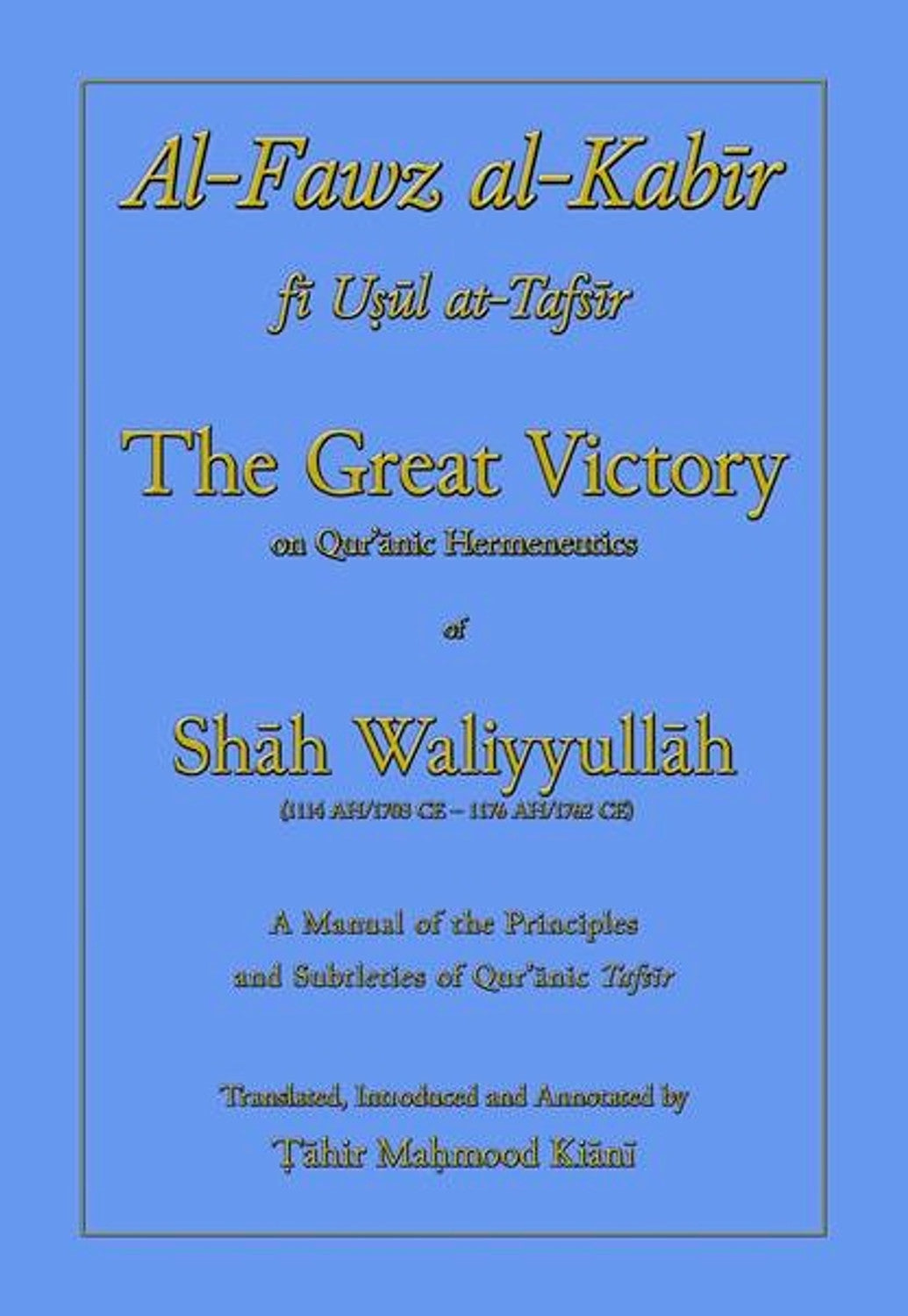 Al-Fawz al-Kabīr fī Uṣūl at-Tafsīr – “The Great Victory, on Qur'ānic Hermeneutics; is a manual of the principles and subtleties of Qur'ānic tafsīr. In it the author outlines the five fundamental sciences that the Qur'ān contains: the science of judgements (aḥkām), reminding others of the Favours of Allah, the Days of Allah and the Life after Death, and giving particular attention to the science of polemics. He also reviews the other sciences of tafsīr such as the circumstances of revelation (asbāb an-nuzūl), abrogating and abrogated āyāt (an-nāsikh wal-mansūkh) and the unusual words and phrases of the Qur'ān (gharāib al-Qur'ān), before concluding the book by looking at the extraordinary and miraculous aspects of the Noble Book, and a final chapter on the meanings of the letters of the Arabic alphabet. Shāh Waliyyullāh was born on 4th Shawwāl 1114 AH/10th February 1703 CE in northern India. He was descended from ‘Umar ibn al - Khaṭṭāb and was thus Qurayshī. He had a traditional education in all the classical sciences from his father and other scholars in India before journeying to Makkah from where he returned in 1145 AH/1733 CE with great knowledge of all the major works of ḥadīth. He dedicated the rest of his life to teaching in the Madrasah Raḥīmiyyah and to writing widely on all the known Islamic sciences as well as working indefatigably for the reform of Indian society and the renewal of the dīn. He died in 1176 AH/1762 CE