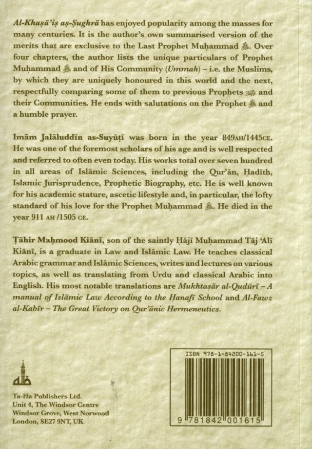 Al-Khasa'is as-Sughra has enjoyed popularity among the masses for many centuries. It is the author's own summarised version of the merits that are exclusive to the Last Prophet Muhammad (SAAS). Over four chapters, the author lists the unique particulars of Prophet Muhammad (SAAS) and of His Community (Ummah)-i.e. the Muslims, by which they are uniquely honoured in this world and the next, respectfully comparing some of them to previous Prophets and their Communities. He ends with salutations on the Prophet (SAAS) and a humble prayer.
