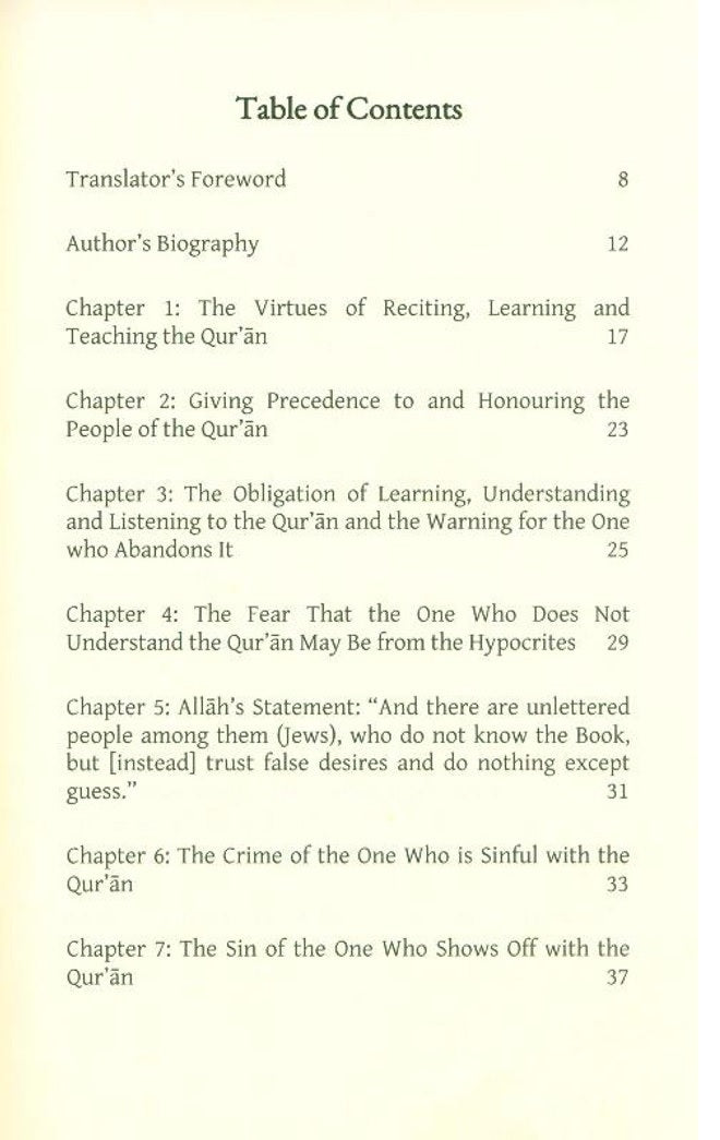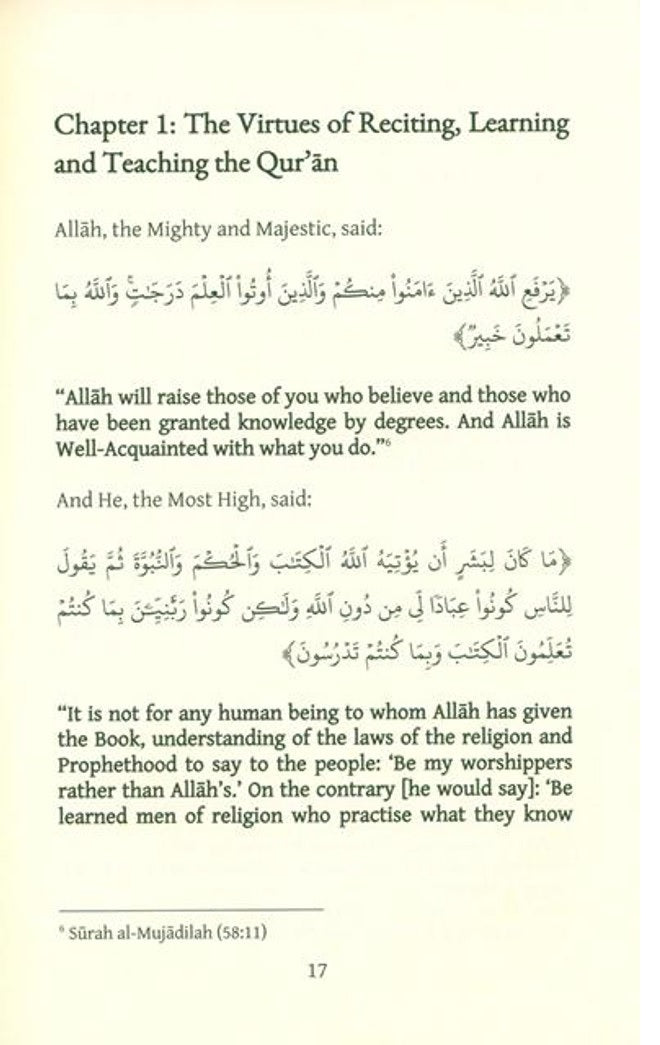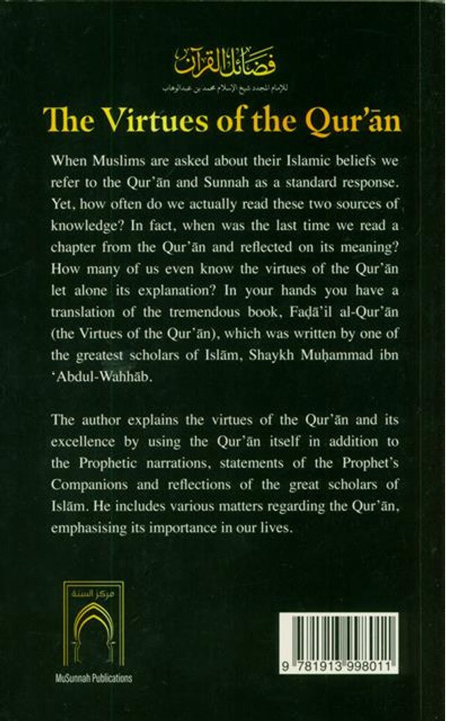 When Muslims are asked about their Islamic beliefs we refer to the Qu'ran and Sunnah as a standard response. Yet, how often do we actually read these two sources of knowledge? In fact, when was the last time we read a chapter from the Qu'ran and reflected on its meaning? How many of us even know the virtues of the Qu'ran let alone its explanation? In your hands you have a translation of the tremendous book, Fada'il al-Qu'ran (the Virtues of the Qur'an), which was written by one of the greatest scholars of Islam, Shaykh Muhammad ibn 'Abdul-Wahab.